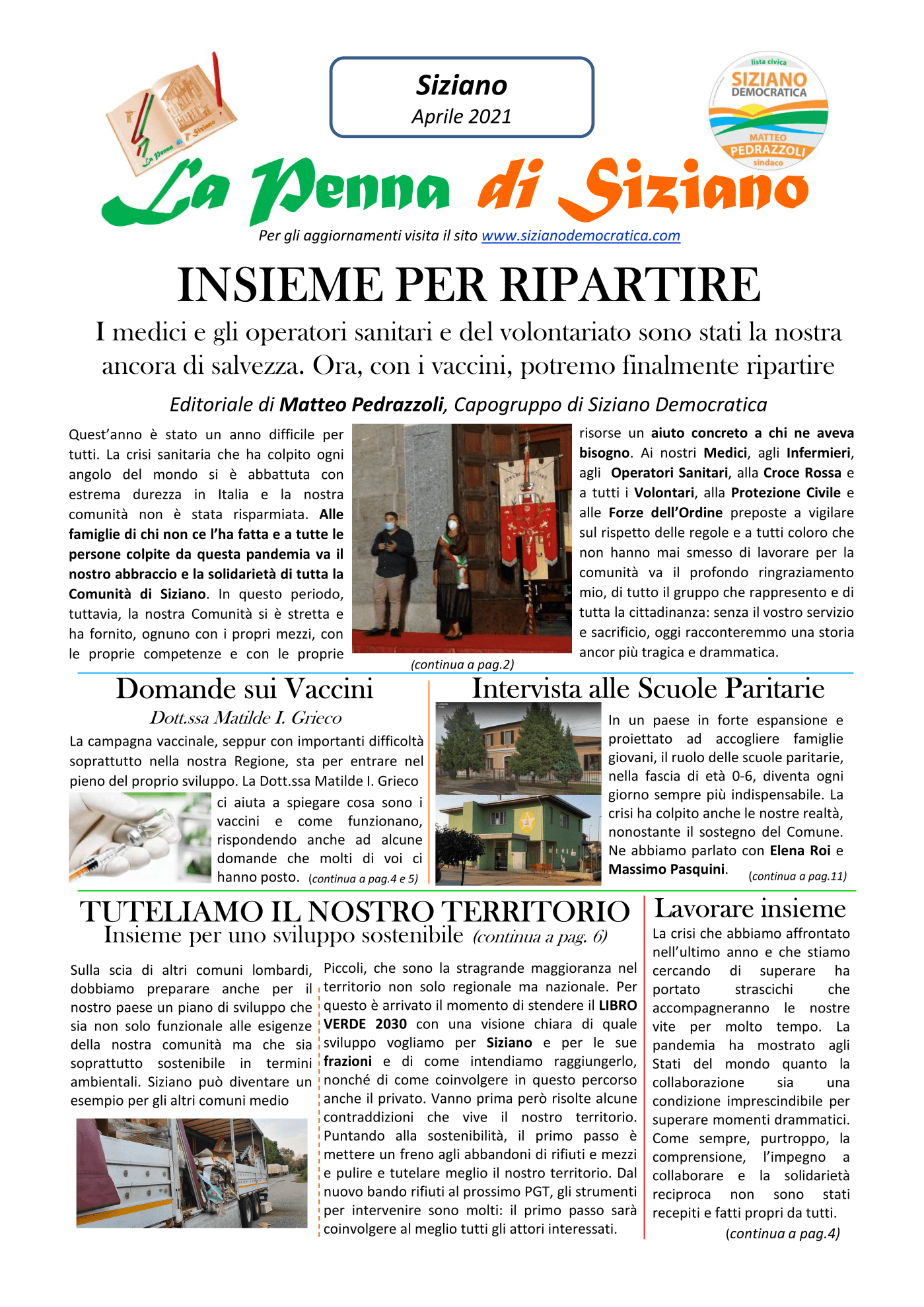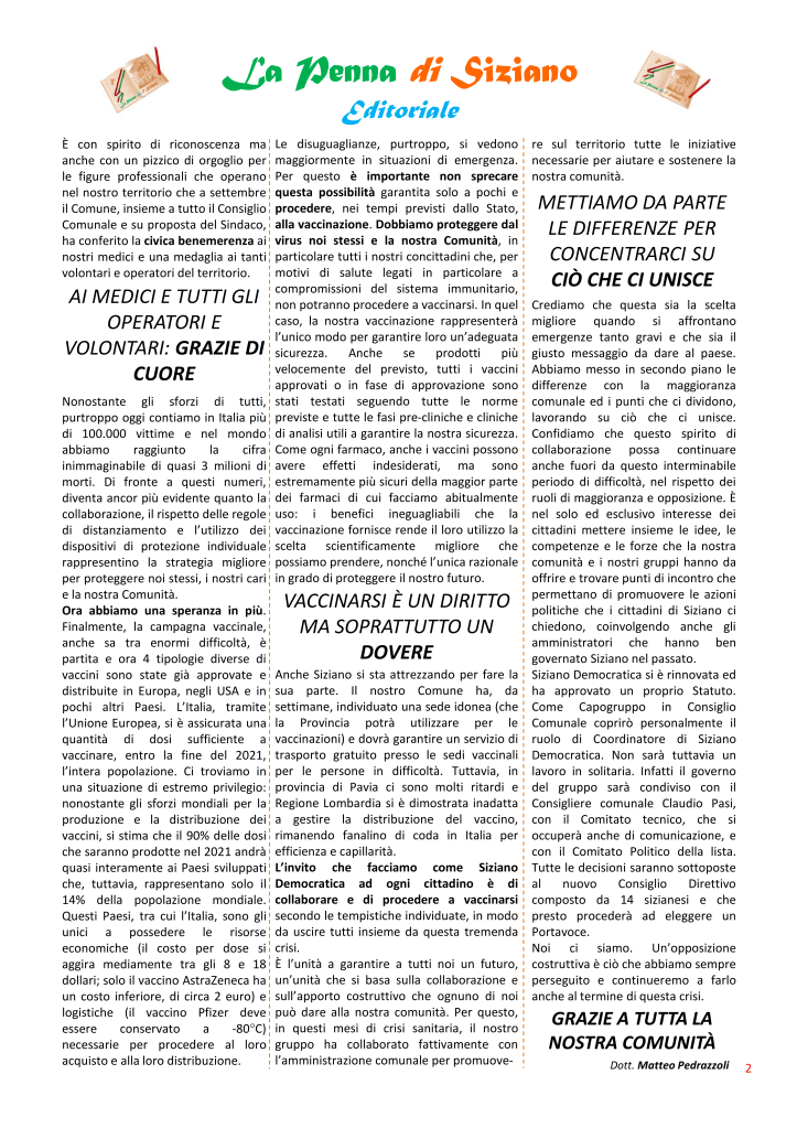 La Penna di Siziano è stata realizzata in proprio: dalla stesura degli articoli all’impaginazione ringraziamo i nostri volontari per il grande lavoro svolto. Il costo è stato coperto interamente dagli aderenti per un totale di 520€ per 2500 copie a colori. La stampa è avvenuta su carta ecologica tramite il sito online della Flyeralarm. I prossimi numeri, salvo eventuali sponsorizzazioni, saranno pubblicati online. Vi invitiamo a seguirci sul sito e sui nostri social: @sizianodemocratica e sulla pagina Instagram ufficiale del Capogruppo Matteo Pedrazzoli.